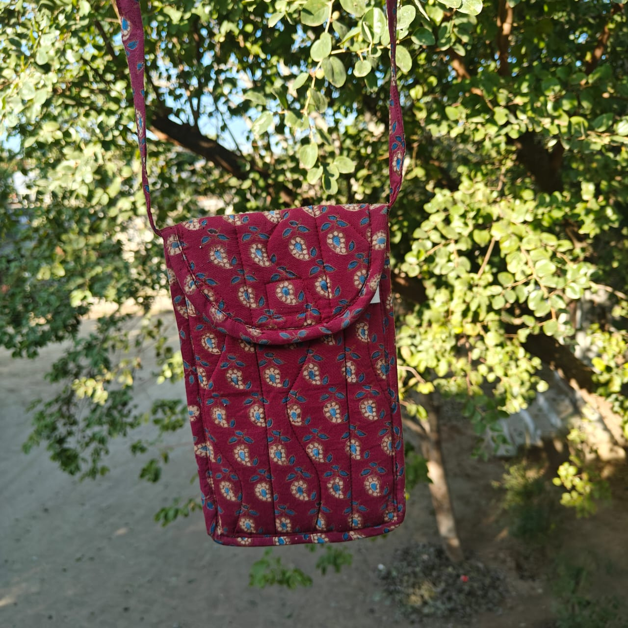 - A sling bag to accommodate your cell phone and keys. It has two pockets, one with a flap and the other without. The long strap attached to the bag makes it easy to carry and use.